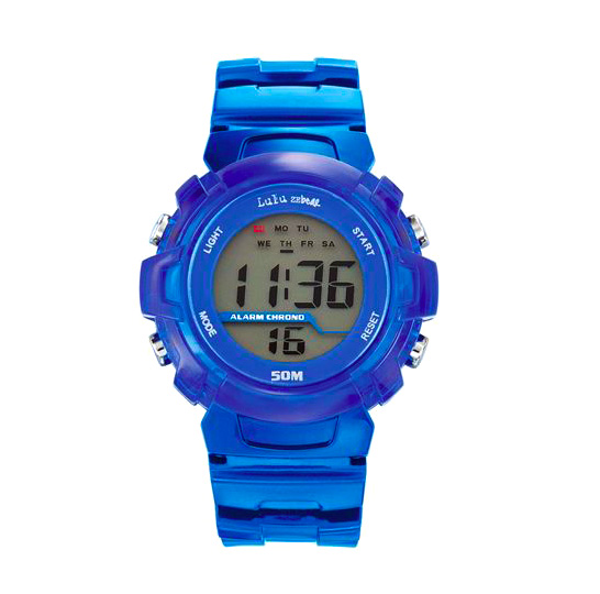 Montre à quartz mixte multifonction composée d’un boîtier en plastique résistant et d’un bracelet en plastique bleu transparent issue de la collection Lulu ZE bear ref : 37018 de la marque Lulu Castagnette.